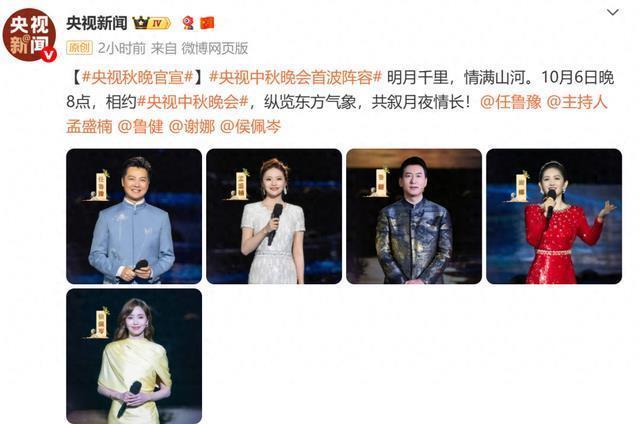 中央广播电视总台2025年中秋晚会将在10月6日晚8点跟全国观众见面,除了中央广播电视总台主持人任鲁豫、孟盛楠、鲁健外,还加入了主持人谢娜和侯佩岑。