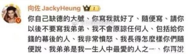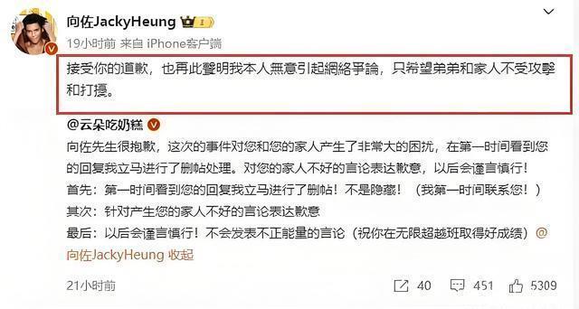 网友很快跟他道歉,他坦然接受对方的道歉,表示无意掀起网络纷争,只希望弟弟和家人不受攻击跟打扰。 可见向佐非常看重自己的家人,不允许任何人侮辱自己的亲人。
