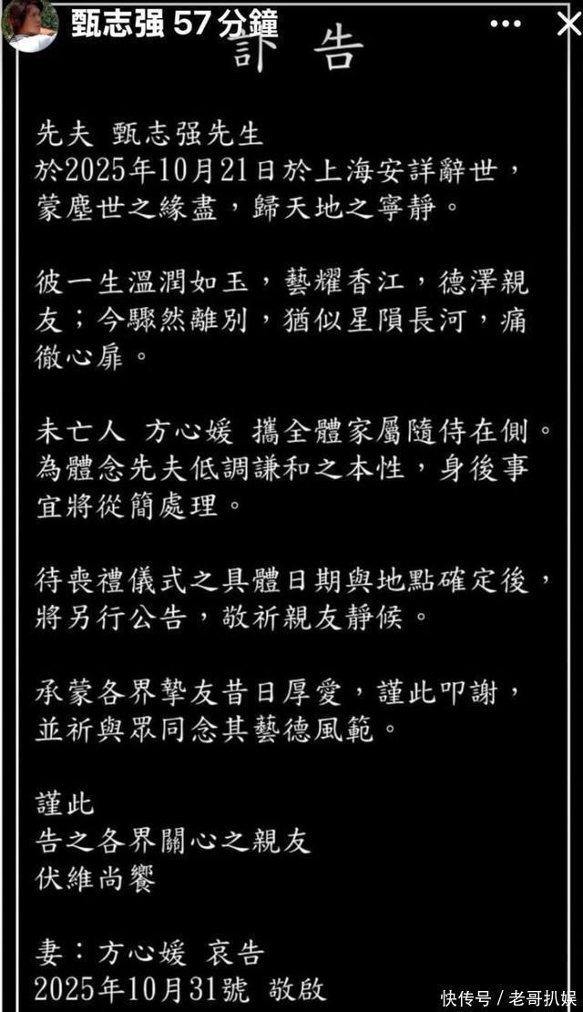 据香港《星岛娱乐》、《01娱乐》等多家娱乐媒体报道,甄志强妻子方心媛今日(10月31日)发布讣告称,丈夫已经于10月21日于上海安详离世,当时全体家属都在身旁,而考虑到丈夫低调谦和的性格,丧事会一切从简,待丧礼仪式和日期确定后,将另行公告,希望亲友静候。